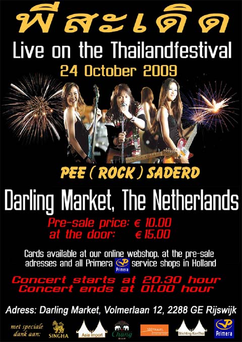 |  De Elephant Parade is dit jaar in Amsterdam . Twee jaar geleden in Rotterdam, vorig jaar in Antwerpen en dit jaar in Amsterdam: de grote openluchttentoonstelling, de Elephant Parade. Een initiatief van Marc en Mike Spits om hiermee een grote donatie op te halen voor de bedreigde Aziatische olifanten. Vanaf 5 september zullen zo’n honderd manshoge olifantenbeelden te zien zijn op diverse locaties in Amsterdam. Zeker vier beschilderde olifanten zullen aanwezig zijn op het Thailand Grand Festival op 5 en 6 september op het Beursplein waardoor het daar een echt Thailand weekend gaat worden. De olifanten zijn beschilderd door kunstenaars uit binnen- en buitenland. De Elephant Parade blijft tot 31 oktober in Amsterdam. Na afloop van de tent-oonstelling zullen de olifanten geveild worden. De opbrengst komt ten goede aan de Elephant Family, een stichting die zich inzet voor het behoud van de Aziatische olifanten. In 2007 bracht de eerste Elephant Parade 248.500 euro op; vorig jaar het recordbedrag van 477.900 euro. Meer info Second Home beurs . Een tweede huis in Thailand, wie droomt daar nou niet van en wil niet genieten van de mogelijkheid om een groot deel van het jaar of om enkele maanden per jaar in het paradijselijke Thailand te kunnen wonen? Op de Second Home International die van 9 t/m 11 oktober 2009 in de Jaarbeurs in Utrecht wordt gehouden kunt u wegdromen bij het zien van de prachtige huizen die door een aantal projectontwikkelaars/verkopers worden aangeboden. Of je nu in het Chiangrai in het noorden of Hua Hin in het zuiden van Thailand zou willen wonen, alle projectontwikkelaars weten je wel naar een project te brengen waar je paleisje gebouwd kan worden. Informatie over een project in Chiangrai kunt u ook op de pagina wonen vinden. |  . Het Thailand Festival heeft dit jaar Pee Sadern 'live on stage'! De Thaise rockband Pee Sadern speelt zaterdag 24 oktober op het Thailand Festival in Rijswijk. Dit tweedaagse festival is hét festival voor alle mensen die geïnteresseerd zijn in Thailand, Thaise cultuur, Thais eten, Thaise producten en reizen naar Thailand. Zaterdag 24 Oktober is het festival geopend van 10.00 uur tot 01.00 uur en zondag 25 Oktober van 10.00 uur tot 20.00 uur. Alle informatie vindt u op www.thailandfestival.nl en www.thai-concerts.com |  Thailand Festival 2009 Zaterdag 24 en zondag 25 oktober Expo – Rijswijk Info: www.thailandfestival.nl Concert Pee Saderd Zaterdag 24 oktober Expo – Rijswijk Info: www.thai-concerts.com  Loy Krathong Festival 2009 Zaterdag 14 november Peelhal - Den Bosch Buddharamatempel - Waalwijk. Info | ||||||||||||||||